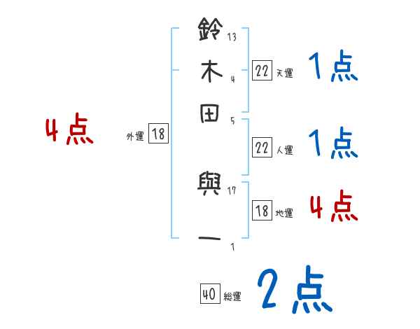 外運![]() | 鈴木田與一さんの外運は18画の4つ星!情熱的で剛気。忍耐力があり信頼される。 生活面を象徴する運勢です。外部から受ける影響力を表し、結婚運、家庭運や職場、環境への順応性を表します。 |
