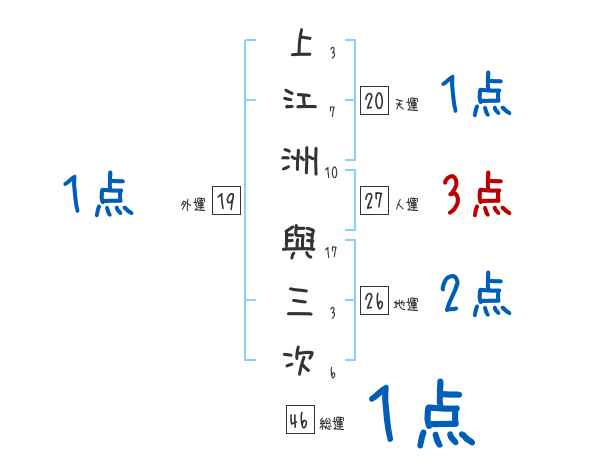 総運![]() | 上江洲與三次さんの総運は46画の1つ星!迷走することが多く苦労するかも。目先のことにとらわれないように。 あなたの人生を表す1番重要な運勢です。生涯を通じて影響する総合運となり、主に50歳以降の晩年期に影響を及ぼします。 |