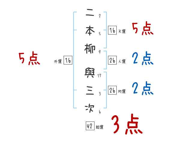 天運![]() | 二本柳與三次さんの天運は16画の5つ星!人望が厚く大きく発展する。逆転成功が見える。 家系が持つ宿命的な運勢を表します。祖先から受け継いだ苗字ですので自分の力が及びません。家柄を象徴します。 |