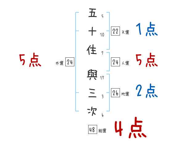 外運![]() | 五十住與三次さんの外運は24画の5つ星!家庭運が良く順調な人生。金運にも恵まれる。 生活面を象徴する運勢です。外部から受ける影響力を表し、結婚運、家庭運や職場、環境への順応性を表します。 |