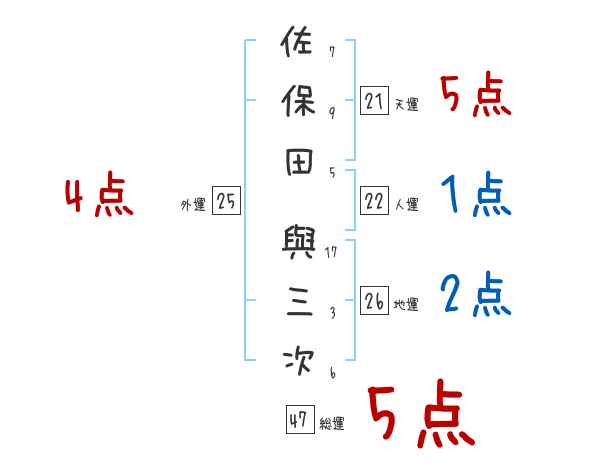 天運![]() | 佐保田與三次さんの天運は21画の5つ星!統率力がある。独立し成功する。名誉を手に入れる。 家系が持つ宿命的な運勢を表します。祖先から受け継いだ苗字ですので自分の力が及びません。家柄を象徴します。 |