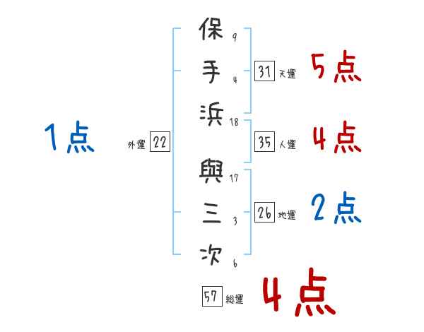 天運![]() | 保手浜與三次さんの天運は31画の5つ星!社交性があり判断力に優れる。順風満帆な人生で円満な生活。 家系が持つ宿命的な運勢を表します。祖先から受け継いだ苗字ですので自分の力が及びません。家柄を象徴します。 |