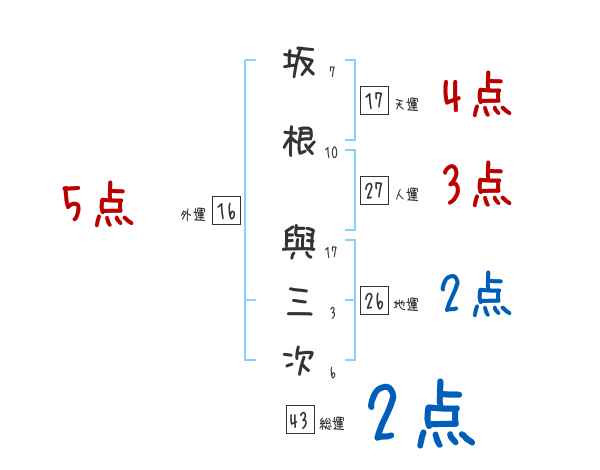 | 外運  | 坂根與三次さんの外運は16画の5つ星!人望が厚く大きく発展する。逆転成功が見える。生活面を象徴する運勢です。外部から受ける影響力を表し、結婚運、家庭運や職場、環境への順応性を表します。 |