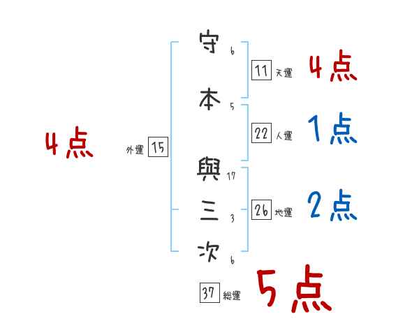 天運![]() | 守本與三次さんの天運は11画の4つ星!着実に富や地位を得る幸運な人生。 家系が持つ宿命的な運勢を表します。祖先から受け継いだ苗字ですので自分の力が及びません。家柄を象徴します。 |