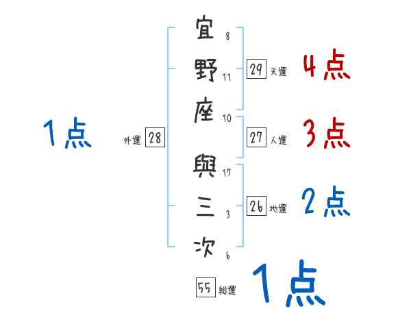 天運![]() | 宜野座與三次さんの天運は29画の4つ星!完全主義で才能がある。厳格な心の持ち主。 家系が持つ宿命的な運勢を表します。祖先から受け継いだ苗字ですので自分の力が及びません。家柄を象徴します。 |