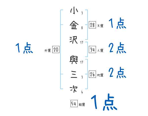 天運![]() | 小金沢與三次さんの天運は28画の1つ星!家庭環境に注意。スポーツで活躍できる能力があるかも。 家系が持つ宿命的な運勢を表します。祖先から受け継いだ苗字ですので自分の力が及びません。家柄を象徴します。 |