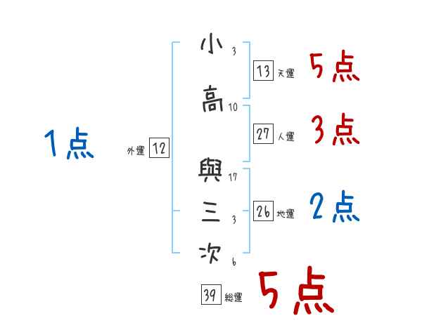 天運![]() | 小高與三次さんの天運は13画の5つ星!才能に恵まれ人気がある。名声を手に入れる。円満な人生。 家系が持つ宿命的な運勢を表します。祖先から受け継いだ苗字ですので自分の力が及びません。家柄を象徴します。 |