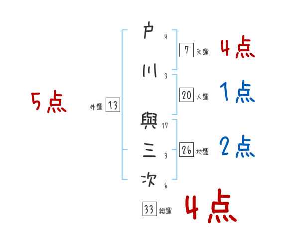 天運![]() | 戸川與三次さんの天運は7画の4つ星!強い意志や信念を持ち独立心が強い。自立する。 家系が持つ宿命的な運勢を表します。祖先から受け継いだ苗字ですので自分の力が及びません。家柄を象徴します。 |