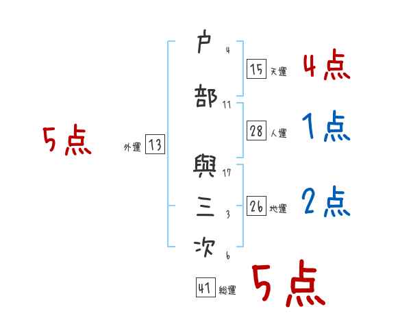 外運![]() | 戸部與三次さんの外運は13画の5つ星!才能に恵まれ人気がある。名声を手に入れる。円満な人生。 生活面を象徴する運勢です。外部から受ける影響力を表し、結婚運、家庭運や職場、環境への順応性を表します。 |