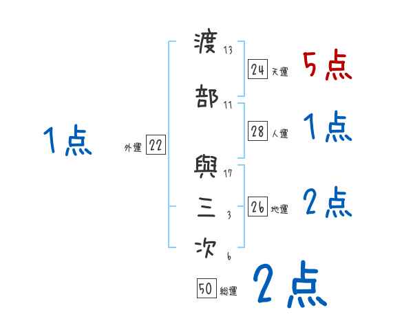 天運![]()  | 渡部與三次さんの天運は24画の5つ星!家庭運が良く順調な人生。金運にも恵まれる。 家系が持つ宿命的な運勢を表します。祖先から受け継いだ苗字ですので自分の力が及びません。家柄を象徴します。 |