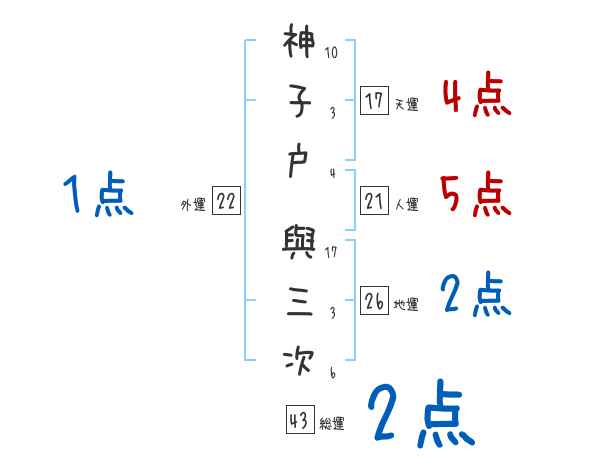 人運![]() | 神子戸與三次さんの人運は21画の5つ星!統率力がある。独立し成功する。名誉を手に入れる。 性格や才能などを表す2番目に重要な運勢です。人間関係や協調性、社会的な成功に影響します。主に20歳から50歳ぐらいまでの中年期の運勢を表します。 |