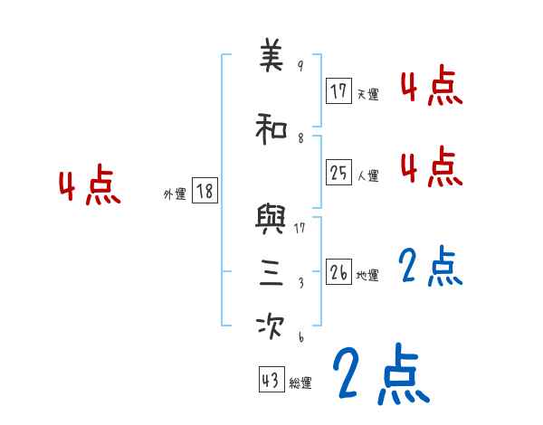 天運![]() | 美和與三次さんの天運は17画の4つ星!積極的な行動力。地位を気づき財産を手に入れる。純粋な心と直感力。 家系が持つ宿命的な運勢を表します。祖先から受け継いだ苗字ですので自分の力が及びません。家柄を象徴します。 |