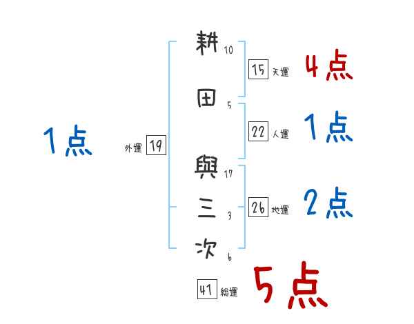 外運![]() | 耕田與三次さんの外運は19画の1つ星!優れた才能を持ちますが、協調性が足りないことも。周りの人と協力する事を意識しましょう。 生活面を象徴する運勢です。外部から受ける影響力を表し、結婚運、家庭運や職場、環境への順応性を表します。 |