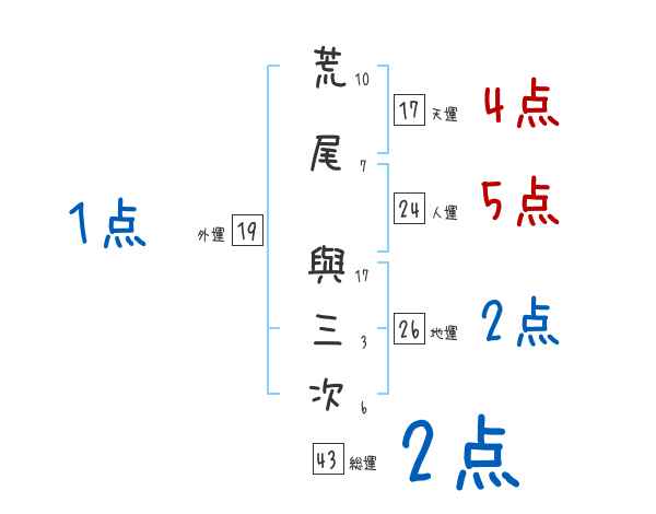 外運![]() | 荒尾與三次さんの外運は19画の1つ星!優れた才能を持ちますが、協調性が足りないことも。周りの人と協力する事を意識しましょう。 生活面を象徴する運勢です。外部から受ける影響力を表し、結婚運、家庭運や職場、環境への順応性を表します。 |