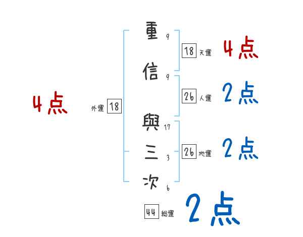 天運![]() | 重信與三次さんの天運は18画の4つ星!情熱的で剛気。忍耐力があり信頼される。 家系が持つ宿命的な運勢を表します。祖先から受け継いだ苗字ですので自分の力が及びません。家柄を象徴します。 |