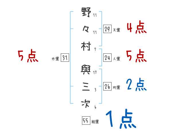 人運![]() | 野々村與三次さんの人運は24画の5つ星!家庭運が良く順調な人生。金運にも恵まれる。 性格や才能などを表す2番目に重要な運勢です。人間関係や協調性、社会的な成功に影響します。主に20歳から50歳ぐらいまでの中年期の運勢を表します。 |