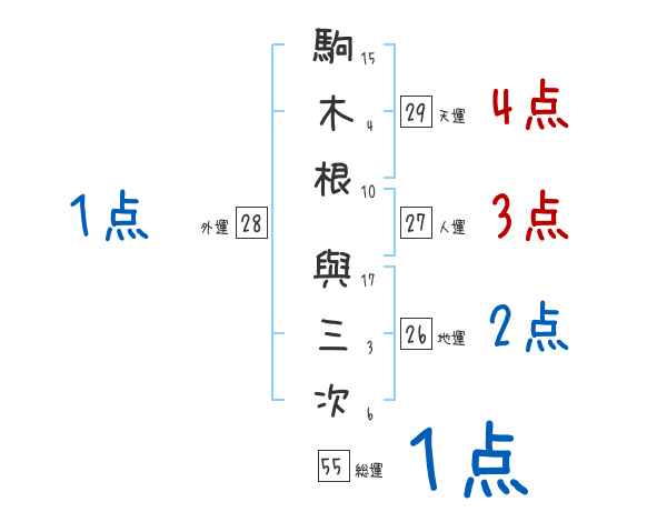 天運![]() | 駒木根與三次さんの天運は29画の4つ星!完全主義で才能がある。厳格な心の持ち主。 家系が持つ宿命的な運勢を表します。祖先から受け継いだ苗字ですので自分の力が及びません。家柄を象徴します。 |