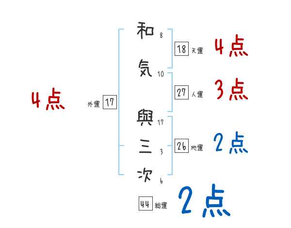 総運![]() | 和気與三次さんの総運は44画の2つ星!誠実で慎重な性格。物事を考えすぎないように注意しましょう。 あなたの人生を表す1番重要な運勢です。生涯を通じて影響する総合運となり、主に50歳以降の晩年期に影響を及ぼします。 |