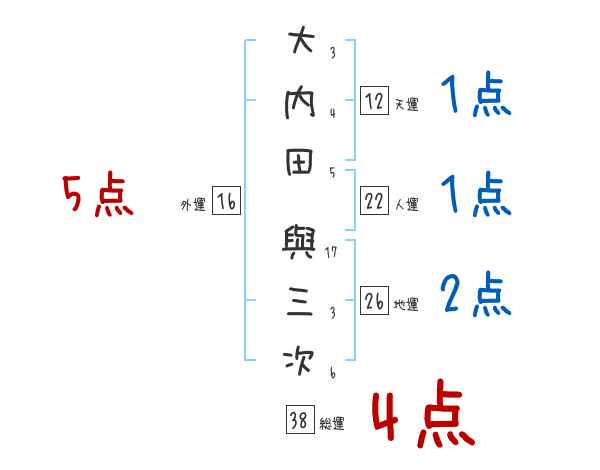 総運![]() | 大内田與三次さんの総運は38画の4つ星!温厚な性格で技術的な才能を発揮する。職人的な仕事に向いている。 あなたの人生を表す1番重要な運勢です。生涯を通じて影響する総合運となり、主に50歳以降の晩年期に影響を及ぼします。 |