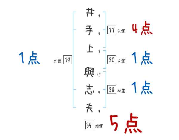 外運![]() | 井手上與志夫さんの外運は19画の1つ星!優れた才能を持ちますが、協調性が足りないことも。周りの人と協力する事を意識しましょう。 生活面を象徴する運勢です。外部から受ける影響力を表し、結婚運、家庭運や職場、環境への順応性を表します。 |