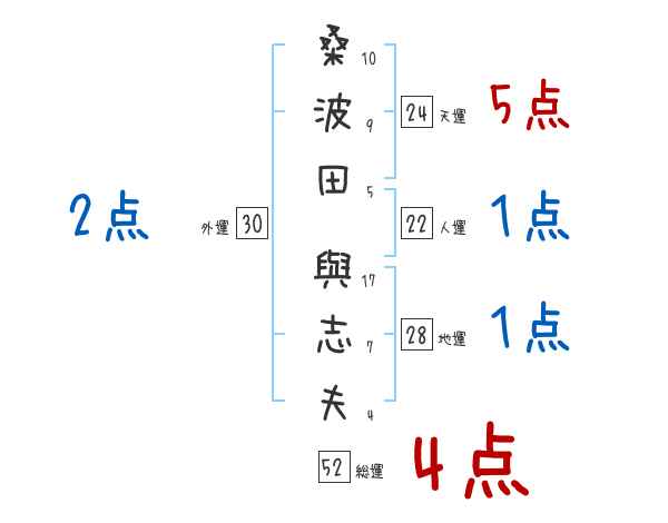 天運![]() | 桑波田與志夫さんの天運は24画の5つ星!家庭運が良く順調な人生。金運にも恵まれる。 家系が持つ宿命的な運勢を表します。祖先から受け継いだ苗字ですので自分の力が及びません。家柄を象徴します。 |
