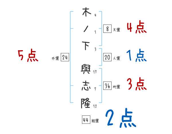 総運![]() | 木ノ下與志隆さんの総運は44画の2つ星!誠実で慎重な性格。物事を考えすぎないように注意しましょう。 あなたの人生を表す1番重要な運勢です。生涯を通じて影響する総合運となり、主に50歳以降の晩年期に影響を及ぼします。 |