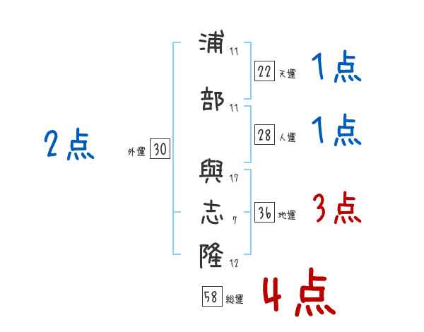 外運![]() | 浦部與志隆さんの外運は30画の2つ星!浮き沈みの激しさに注意しましょう。 生活面を象徴する運勢です。外部から受ける影響力を表し、結婚運、家庭運や職場、環境への順応性を表します。 |