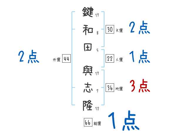 天運![]() | 鍵和田與志隆さんの天運は30画の2つ星!浮き沈みの激しさに注意しましょう。 家系が持つ宿命的な運勢を表します。祖先から受け継いだ苗字ですので自分の力が及びません。家柄を象徴します。 |