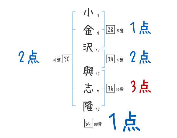 天運![]() | 小金沢與志隆さんの天運は28画の1つ星!家庭環境に注意。スポーツで活躍できる能力があるかも。 家系が持つ宿命的な運勢を表します。祖先から受け継いだ苗字ですので自分の力が及びません。家柄を象徴します。 |