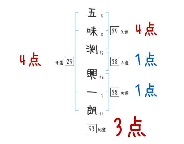 天運![]() | 五味渕興一朗さんの天運は25画の4つ星!個性があり才能があふれる。強運の持ち主で発展する。 家系が持つ宿命的な運勢を表します。祖先から受け継いだ苗字ですので自分の力が及びません。家柄を象徴します。 |