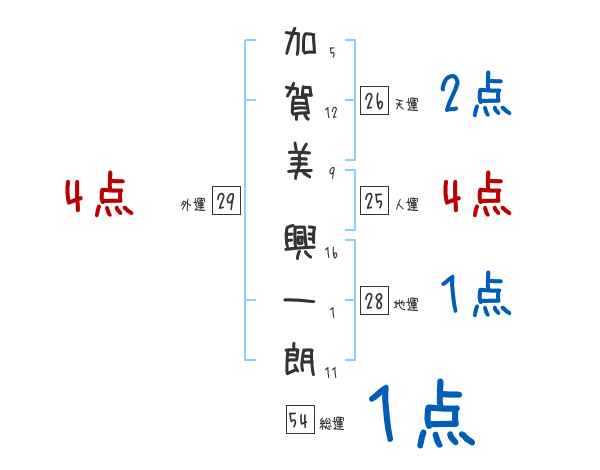 総運![]() | 加賀美興一朗さんの総運は54画の1つ星!トラブルが多いかも。周りをよく見て協調して過ごしましょう。 あなたの人生を表す1番重要な運勢です。生涯を通じて影響する総合運となり、主に50歳以降の晩年期に影響を及ぼします。 |