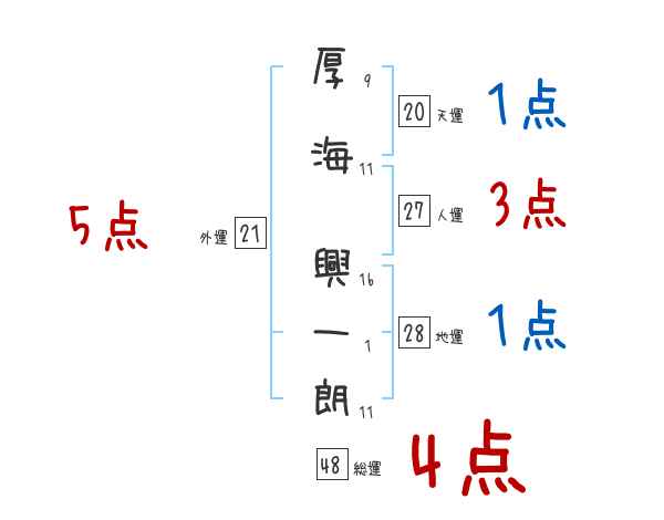 外運![]() | 厚海興一朗さんの外運は21画の5つ星!統率力がある。独立し成功する。名誉を手に入れる。 生活面を象徴する運勢です。外部から受ける影響力を表し、結婚運、家庭運や職場、環境への順応性を表します。 |