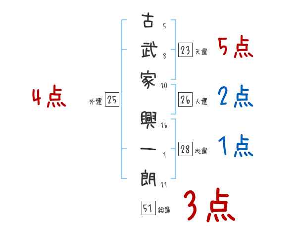 天運![]() | 古武家興一朗さんの天運は23画の5つ星!想像力に優れ活力がある。一代で成功し名誉を手に入れる。 家系が持つ宿命的な運勢を表します。祖先から受け継いだ苗字ですので自分の力が及びません。家柄を象徴します。 |
