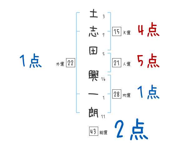 総運![]() | 土志田興一朗さんの総運は43画の2つ星!頑固な性格で独立心が強いかも。やや非現実的で浪費に注意しましょう。 あなたの人生を表す1番重要な運勢です。生涯を通じて影響する総合運となり、主に50歳以降の晩年期に影響を及ぼします。 |