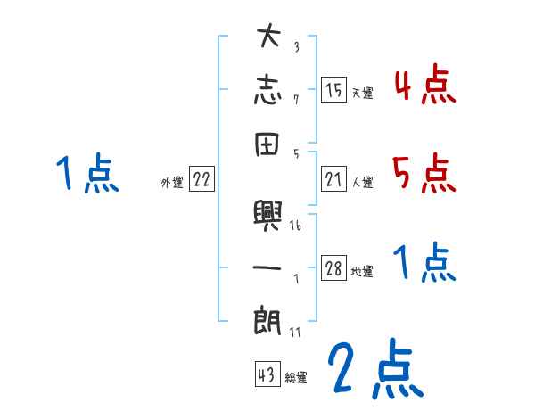 総運![]() | 大志田興一朗さんの総運は43画の2つ星!頑固な性格で独立心が強いかも。やや非現実的で浪費に注意しましょう。 あなたの人生を表す1番重要な運勢です。生涯を通じて影響する総合運となり、主に50歳以降の晩年期に影響を及ぼします。 |
