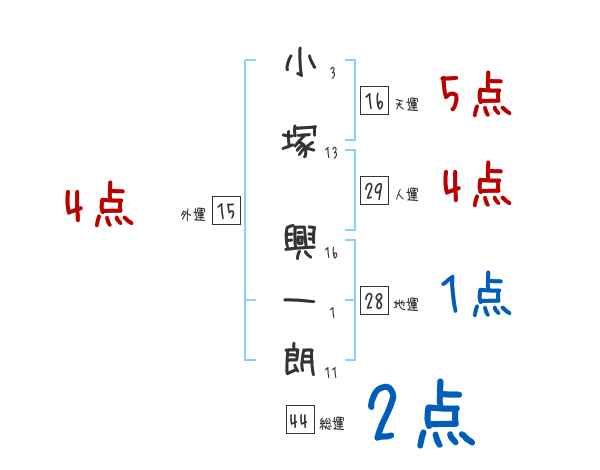| 外運  | 小塚興一朗さんの外運は15画の4つ星!人徳があり出世する。順調に物事を進め円満な人生。生活面を象徴する運勢です。外部から受ける影響力を表し、結婚運、家庭運や職場、環境への順応性を表します。 |