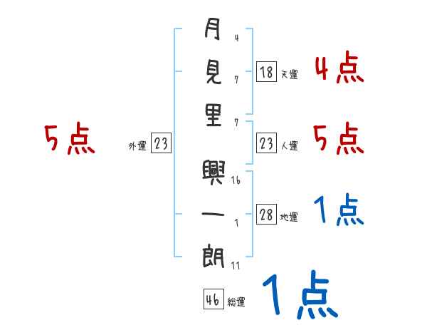 人運![]() | 月見里興一朗さんの人運は23画の5つ星!想像力に優れ活力がある。一代で成功し名誉を手に入れる。 性格や才能などを表す2番目に重要な運勢です。人間関係や協調性、社会的な成功に影響します。主に20歳から50歳ぐらいまでの中年期の運勢を表します。 |