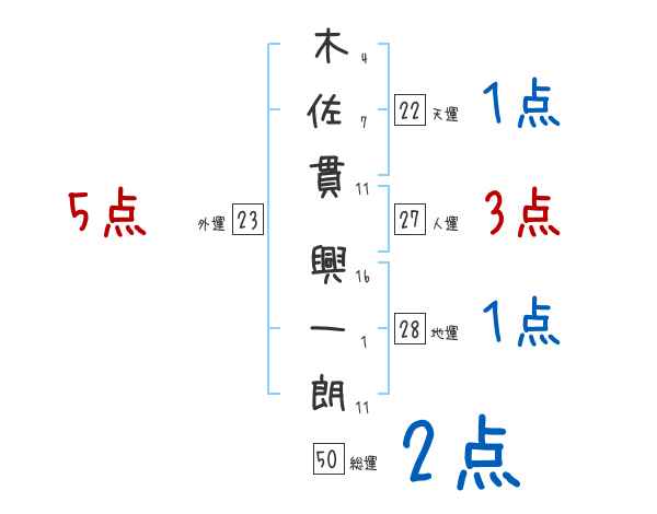 外運![]() | 木佐貫興一朗さんの外運は23画の5つ星!想像力に優れ活力がある。一代で成功し名誉を手に入れる。 生活面を象徴する運勢です。外部から受ける影響力を表し、結婚運、家庭運や職場、環境への順応性を表します。 |