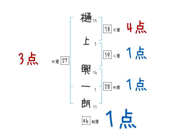 天運![]() | 樋上興一朗さんの天運は18画の4つ星!情熱的で剛気。忍耐力があり信頼される。 家系が持つ宿命的な運勢を表します。祖先から受け継いだ苗字ですので自分の力が及びません。家柄を象徴します。 |