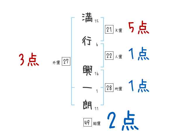 天運![]() | 満行興一朗さんの天運は21画の5つ星!統率力がある。独立し成功する。名誉を手に入れる。 家系が持つ宿命的な運勢を表します。祖先から受け継いだ苗字ですので自分の力が及びません。家柄を象徴します。 |