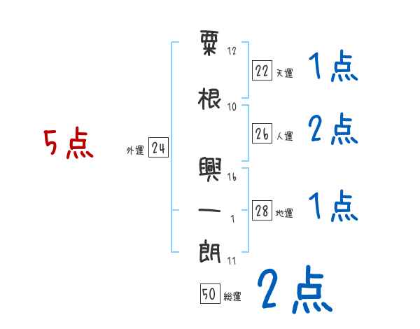 外運![]() | 粟根興一朗さんの外運は24画の5つ星!家庭運が良く順調な人生。金運にも恵まれる。 生活面を象徴する運勢です。外部から受ける影響力を表し、結婚運、家庭運や職場、環境への順応性を表します。 |