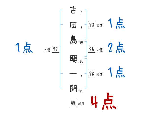 総運![]() | 古田島興一朗さんの総運は48画の4つ星!賢明な性格で人望が厚い。指導力があり多くの人に尊敬される。 あなたの人生を表す1番重要な運勢です。生涯を通じて影響する総合運となり、主に50歳以降の晩年期に影響を及ぼします。 |