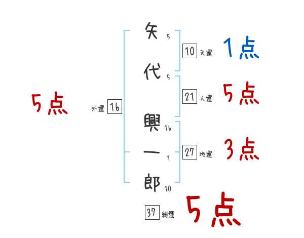 天運![]() | 矢代興一郎さんの天運は10画の1つ星!不安を感じやすい傾向。ストレスを抱えないように注意しましょう。 家系が持つ宿命的な運勢を表します。祖先から受け継いだ苗字ですので自分の力が及びません。家柄を象徴します。 |