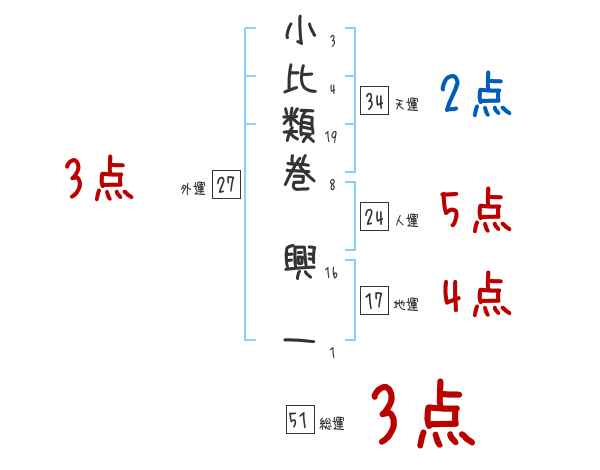 総運![]() | 小比類巻興一さんの総運は51画の3つ星!変化が激しく、危険に注意。堅実な性格。 あなたの人生を表す1番重要な運勢です。生涯を通じて影響する総合運となり、主に50歳以降の晩年期に影響を及ぼします。 |