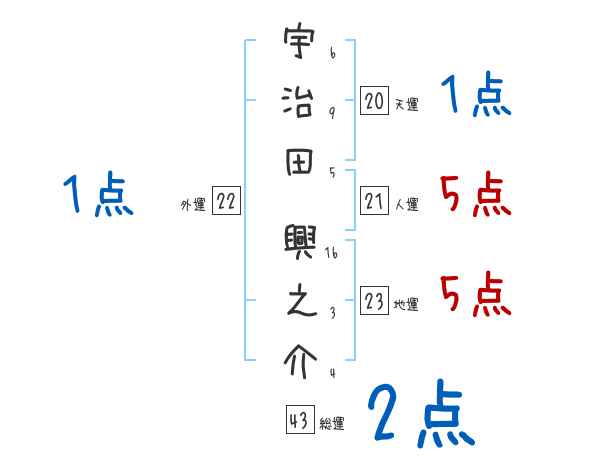 総運![]() | 宇治田興之介さんの総運は43画の2つ星!頑固な性格で独立心が強いかも。やや非現実的で浪費に注意しましょう。 あなたの人生を表す1番重要な運勢です。生涯を通じて影響する総合運となり、主に50歳以降の晩年期に影響を及ぼします。 |