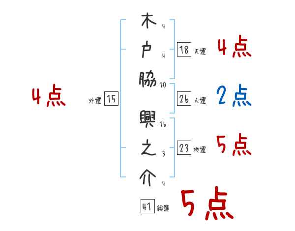 天運![]() | 木戸脇興之介さんの天運は18画の4つ星!情熱的で剛気。忍耐力があり信頼される。 家系が持つ宿命的な運勢を表します。祖先から受け継いだ苗字ですので自分の力が及びません。家柄を象徴します。 |