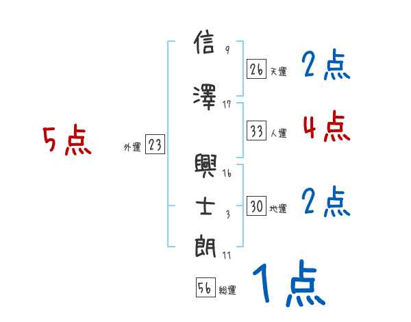総運![]() | 信澤興士朗さんの総運は56画の1つ星!消極的で無気力になりがち。誠実な気持ちが必要でしょう。 あなたの人生を表す1番重要な運勢です。生涯を通じて影響する総合運となり、主に50歳以降の晩年期に影響を及ぼします。 |
