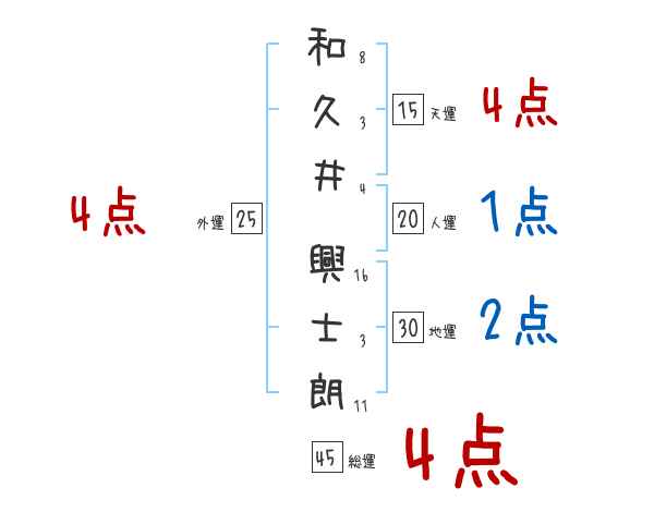 総運![]() | 和久井興士朗さんの総運は45画の4つ星!もくもくと物事を進め達成する。地味な努力家。 あなたの人生を表す1番重要な運勢です。生涯を通じて影響する総合運となり、主に50歳以降の晩年期に影響を及ぼします。 |