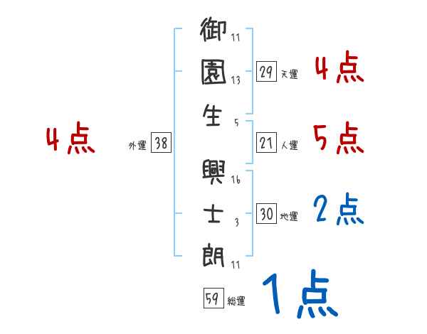 総運![]() | 御園生興士朗さんの総運は59画の1つ星!意志の弱さであきらめることが多いかも。粘り強さが必要。 あなたの人生を表す1番重要な運勢です。生涯を通じて影響する総合運となり、主に50歳以降の晩年期に影響を及ぼします。 |