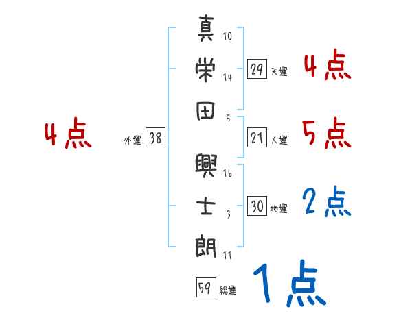 天運![]() | 真栄田興士朗さんの天運は29画の4つ星!完全主義で才能がある。厳格な心の持ち主。 家系が持つ宿命的な運勢を表します。祖先から受け継いだ苗字ですので自分の力が及びません。家柄を象徴します。 |